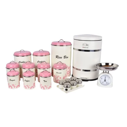 - یک عدد سطل زباله پدالی در ابعاد ۴۷ × ۲۹ × ۲۹ به وزن ۲۰۰۰ گرم - یک عدد سطل برنج به ابعاد ۴۰ × ۲۱.۵ × ۲۱.۵ به وزن ۶۲۵ - دو عدد سطل به ابعاد ۲۸ × ۱۸ × ۱۸ به وزن ۵۸۵ گرم - چهار عدد سطل بع ابعاد ۱۹ × ۱۳ × ۱۳ به وزن ۳۲۰ گرم - سه عدد سطل به ابعاد ۱۷ × ۱۰.۵ × ۱۰.۵ به وزن ۲۳۰ گرم - شامل یک ترازو - شامل ۶ عدد ظرف ادویه